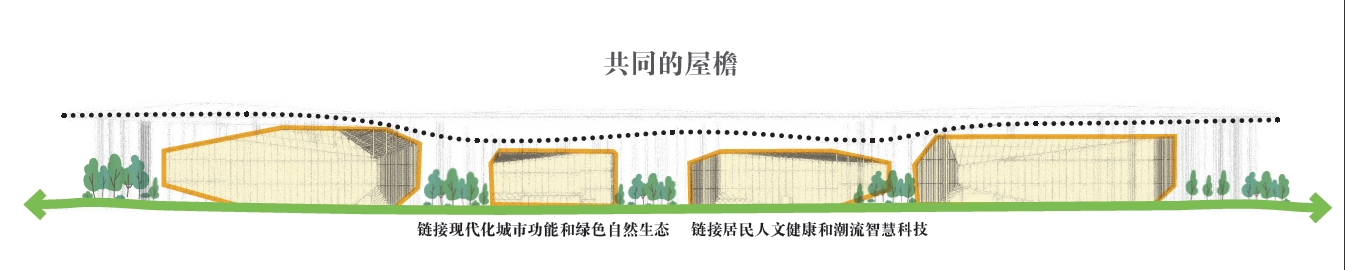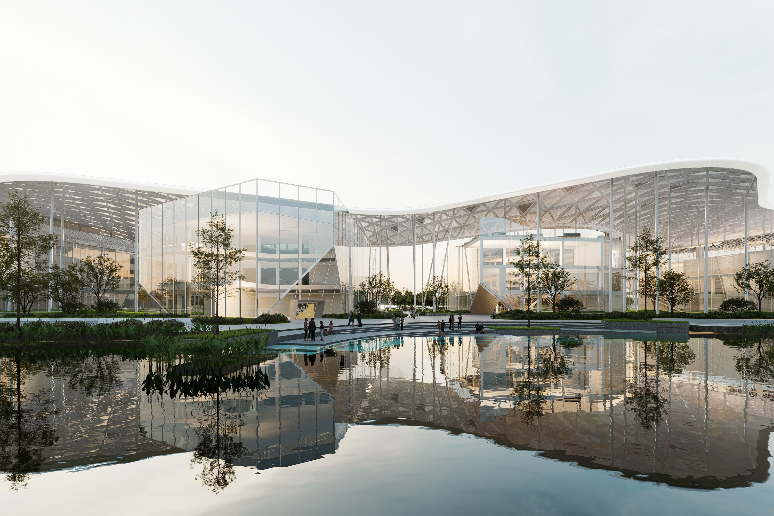 該項目整體設計結合“科技晶體”與“智慧森林”,鏈接現代城市功能與綠色自然生態,鏈接潮流智慧科技與居民人文健康。流線形態的膜結構棚架塑造“共同的屋檐”,其下四個晶瑩剔透的鉆石形建筑體量,打造千燈鎮的新地標。