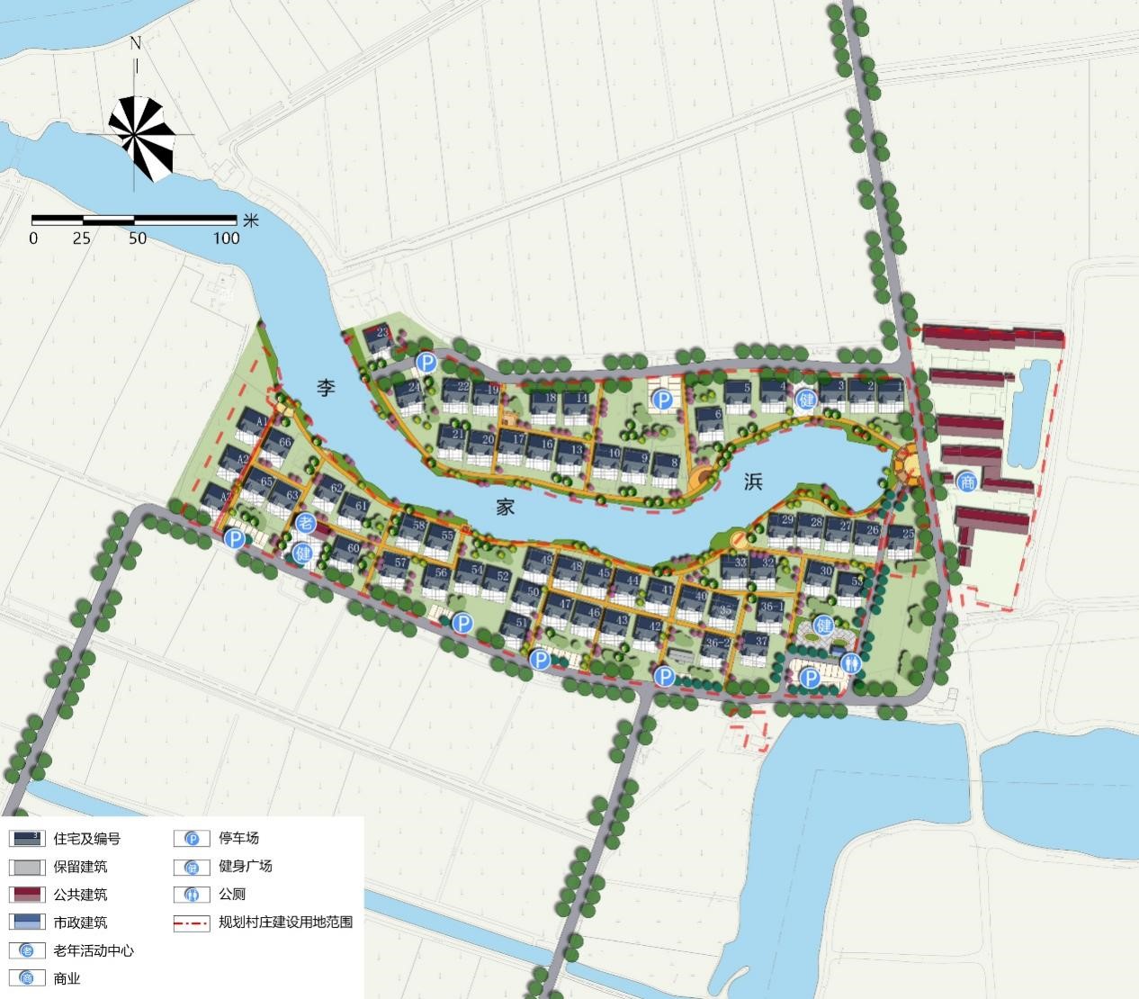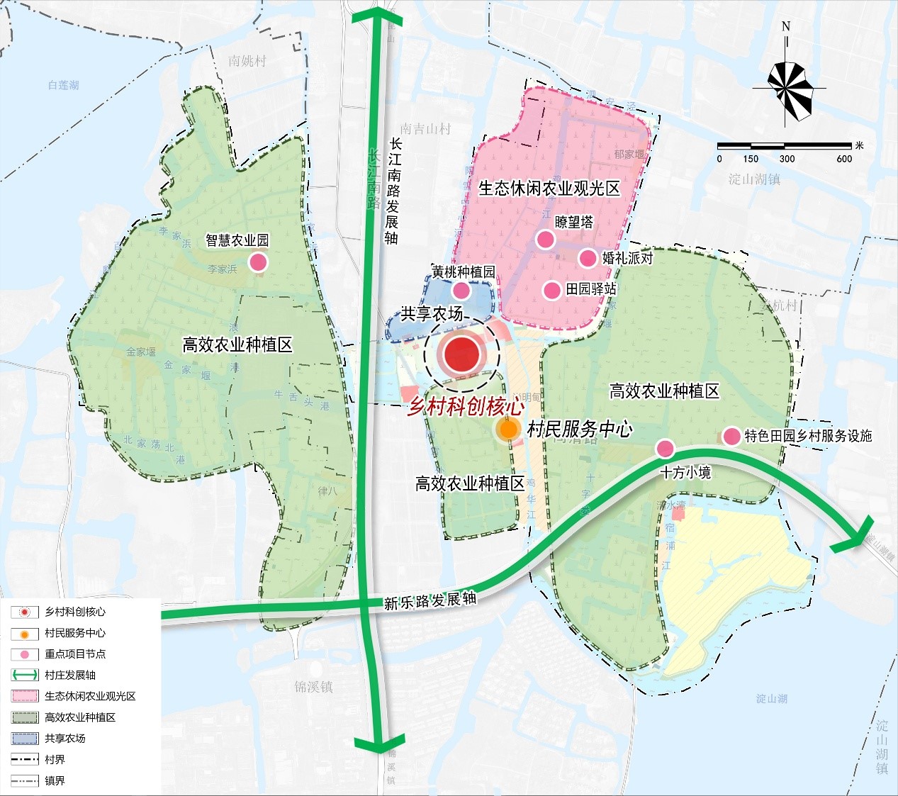 兩軸:依托長江南路、新樂路串聯各個分區,打造村莊發展軸;