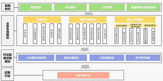 基于現狀基礎研究,以促進鄉村全面振興為目標,梳理現狀村莊問題及發展訴求,落實上位及相關規劃要求,統籌協調各類空間矛盾,堅持問題導向與目標導向相結合,開展“多規合一”的實用性村莊規劃編制工作,制定近期實施計劃,形成可實施的一張藍圖。