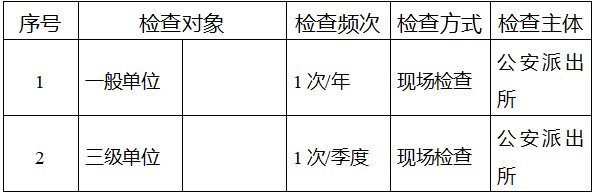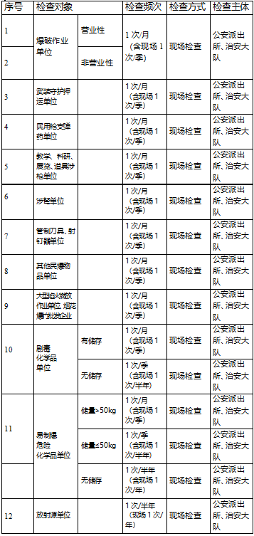 1.治安檢查。檢查對象為旅館業、公章刻制從業單位、特種行業從業單位、槍支單位、民用爆炸物品從業單位、煙花爆竹從業單位、危險化學品從業單位、易制毒化學品從業單位、保安服務業、保安培訓業、娛樂場所以及公共場所;大型群眾性活動場所;企事業單位、校園、出租房等場所。