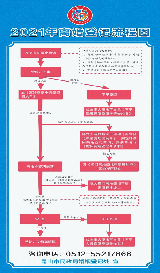 根據《中華人民共和國民法典》第一千零七十六條、第一千零七十七條和一千零七十八條規定,2021年1月1日起離婚登記按如下程序辦理: