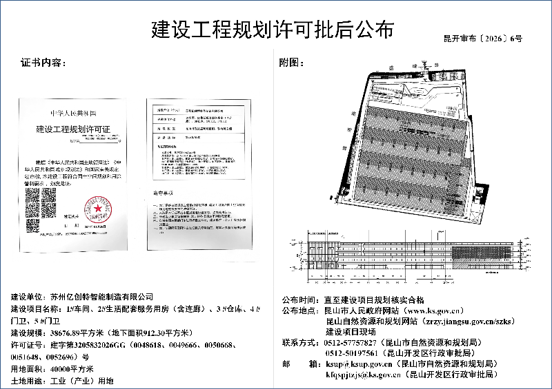 蘇州億創(chuàng)特智能制造有限公司1#車間、2#生活配套服務(wù)用房(含連廊)、3#倉庫、4#門衛(wèi)、5#門衛(wèi)建設(shè)工程規(guī)劃許可批后公布