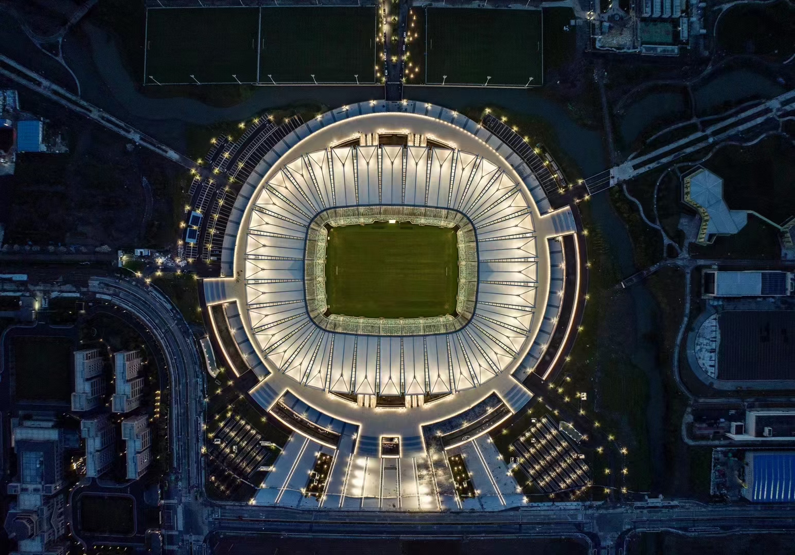 昆山奧體中心是在中國準備舉辦2023亞足聯亞洲杯契機下,對照FIFA標準建造的專業足球場,于2020年11月開工,2023年5月建成投用,總造價23.8億元,現為昆山文商旅集團旗下資產。場館占地面積約200000平方米,總建筑面積約135093平方米,專業足球場面積為107951平方米,共5層,高度47.4米。足球場設置4.5萬個觀眾坐席、86個商務包廂,是目前江蘇省唯一一座滿足國際足聯比賽要求的國際一流的專業足球場。昆山奧體中心距離上海虹橋機場約47公里【車程約60分鐘】,距離昆山高鐵站16公里【昆山到上海虹橋高鐵站18分鐘,到蘇州站25分鐘】。蘇州軌道交通11號線,距離場館較近處設有兵希站、夏駕河公園站和盛莊站,步行距離1.5-3公里。周邊10公里范圍內,有時代皇冠假日酒店、金陵大飯店、隆祺建國飯店、金鷹尚美酒店等多家豪華酒店及商業配套設施。