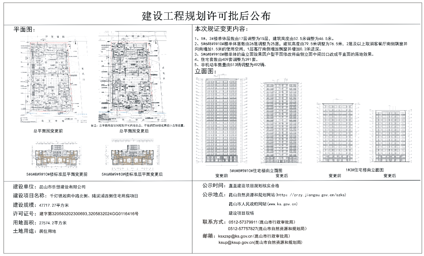 昆山市樂想建設有限公司建設千燈鎮淞南中路北側、陸泥浦西側住宅用房項目(變更)批后公布